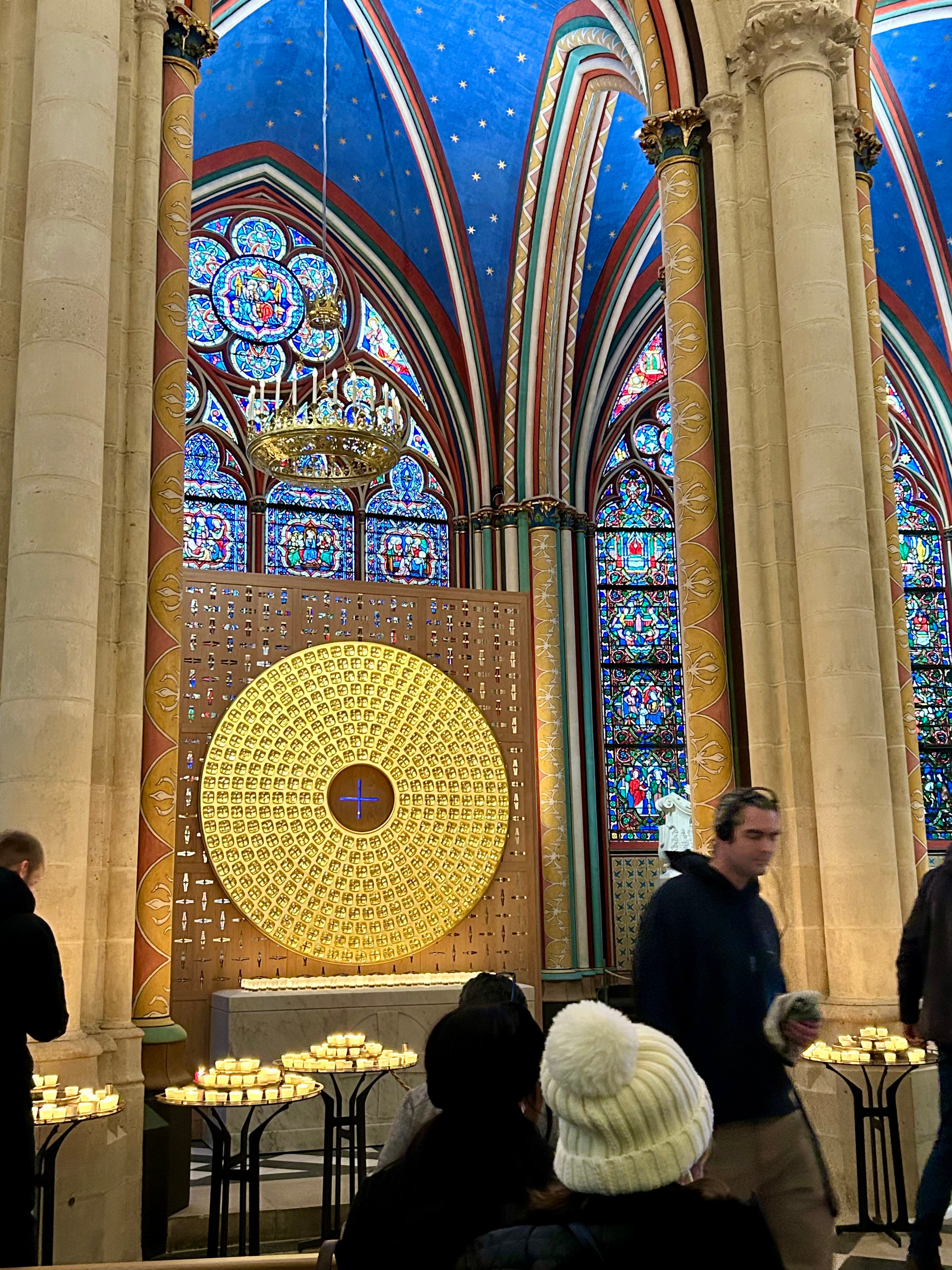 To get to the crèche, you walk down the left side of the sanctuary. Passing the crèche takes you to all the chapels where one can pray to a specific Saint. Most did not have finished stain glass windows but instead a pattern that was a holding place. My understanding is that the stain-glass, the gargoyles, and the spire will all be continuing work for the next couple of years. At the back was a large chapel dedicated to the Crown of Thorns that has been in Paris since Louis IX acquired it. It was orignially housed in the Cathedrale but moved to Saint Chapelle which Louis IX built specifically to house the artifact. During the renovation, it has been on view in the Louvre.