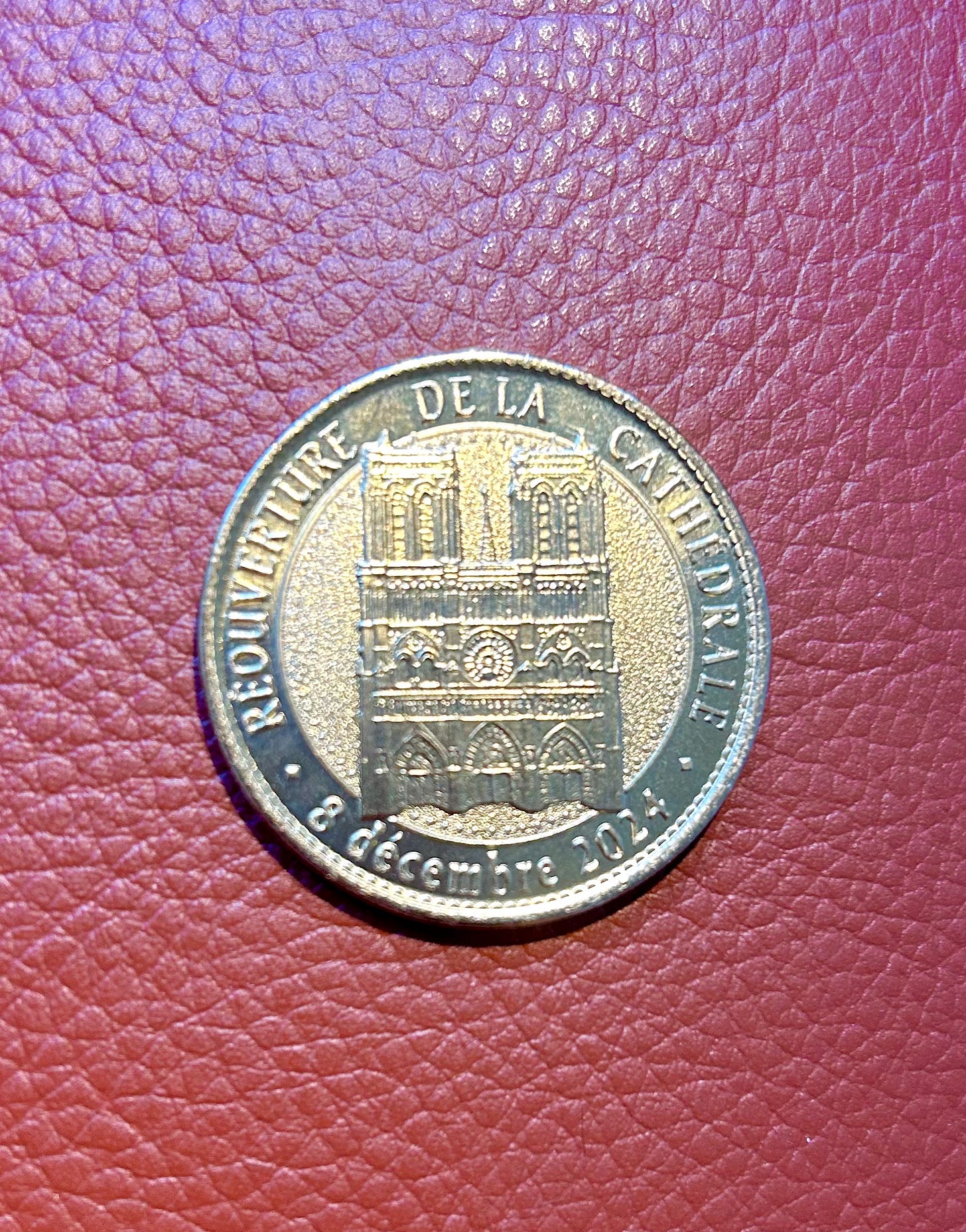 As we made our way to the exit doors, we passed a machine of souvenirs. For three euros, I received a ‘gold’ coin that says Reouverture de la Cathedrale 8 décembre 2024.
