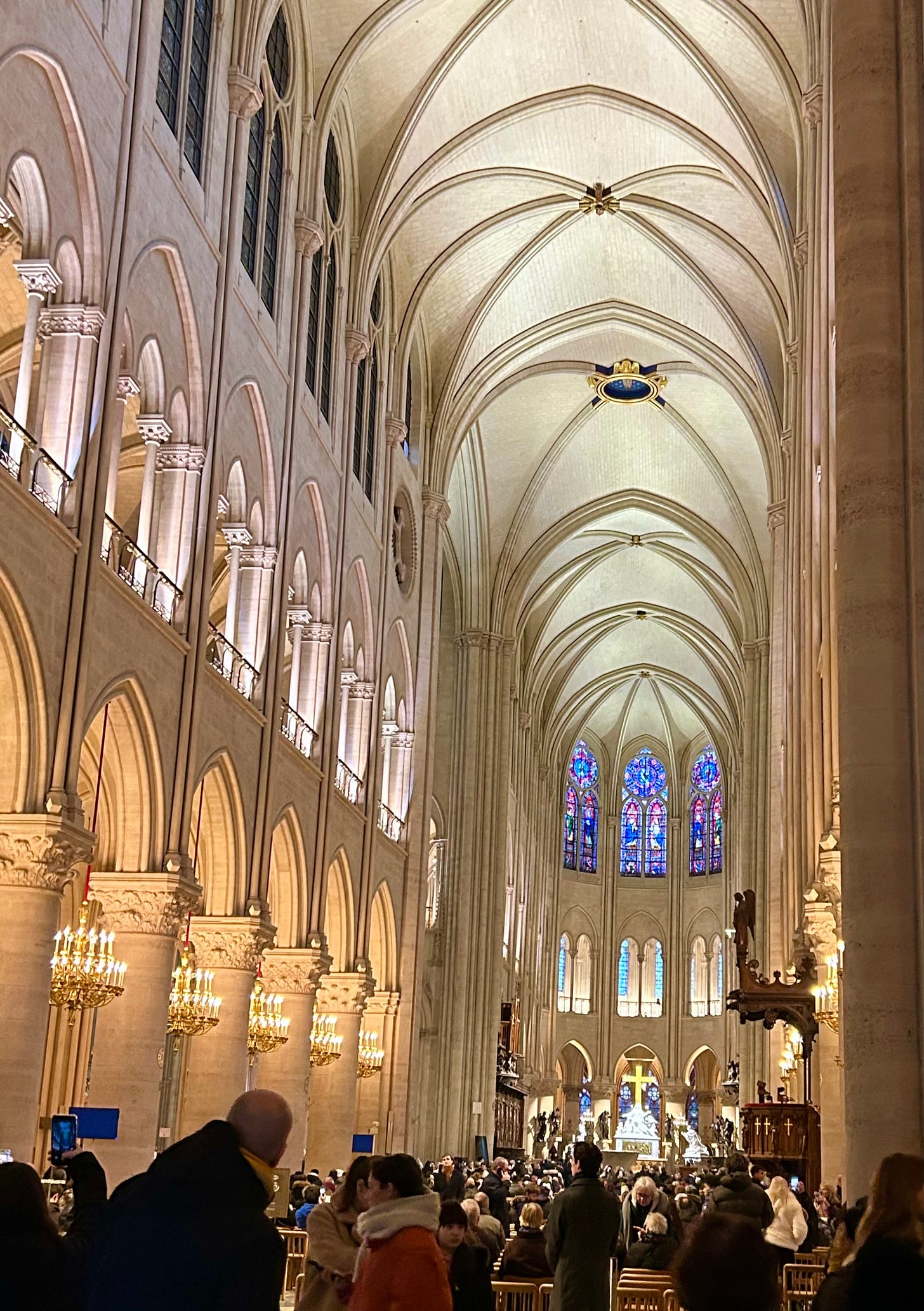 We have all seen photos of the new inside. Because of spot lights, it all looked so WHITE, so BRIGHT, so unNotre Dame, even though it looked spectacular. I wasn’t sure I would love it the way everyone else had.