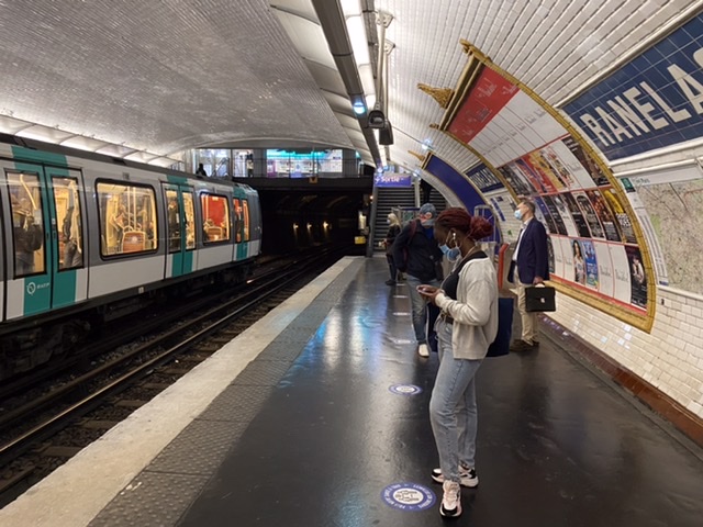 I rode the #9 metro with my mask on. From my stop in the 16th to St. Ambroise in the 11th is approximately 40 minutes. Everyone wears masks on public transportation. We are encouraged by the 130 euro fine to be paid if we are caught unmasked. The wearing of masks seems to sober people up. There isn’t much talking, frivolity and no buskers in any of the cars. We get on, hope to find a seat which are marked so that, ideally, one would not sit next to another person, then get off.