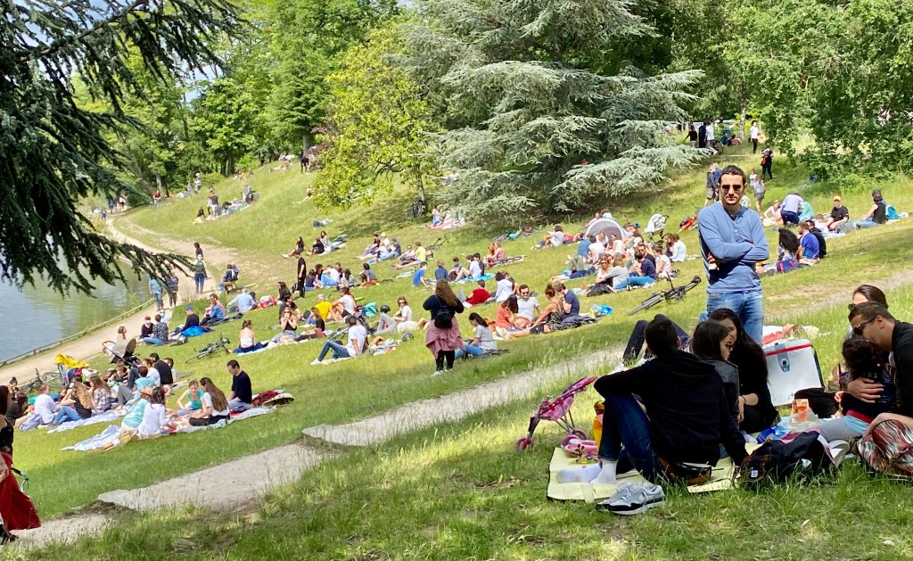 Parisians enjoying sunshine at Bois de Boulogne. Very few masks and definitely more than 10 people in groups all over the grass.
