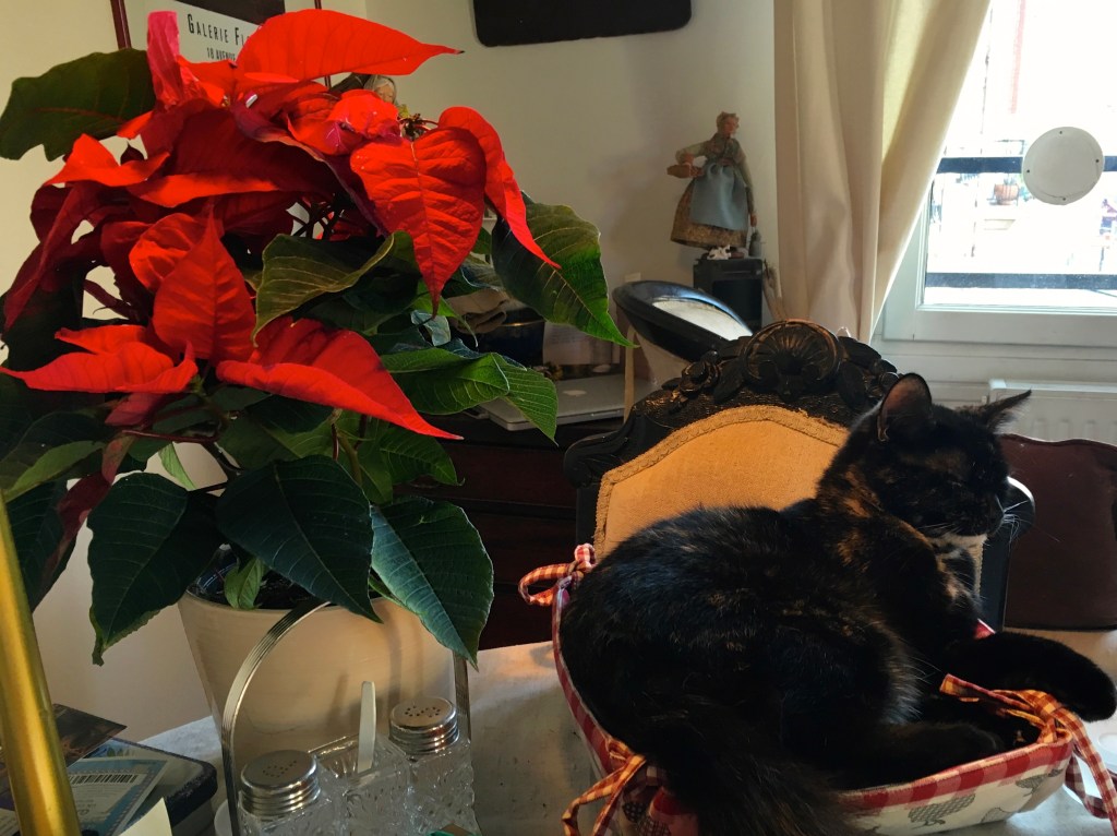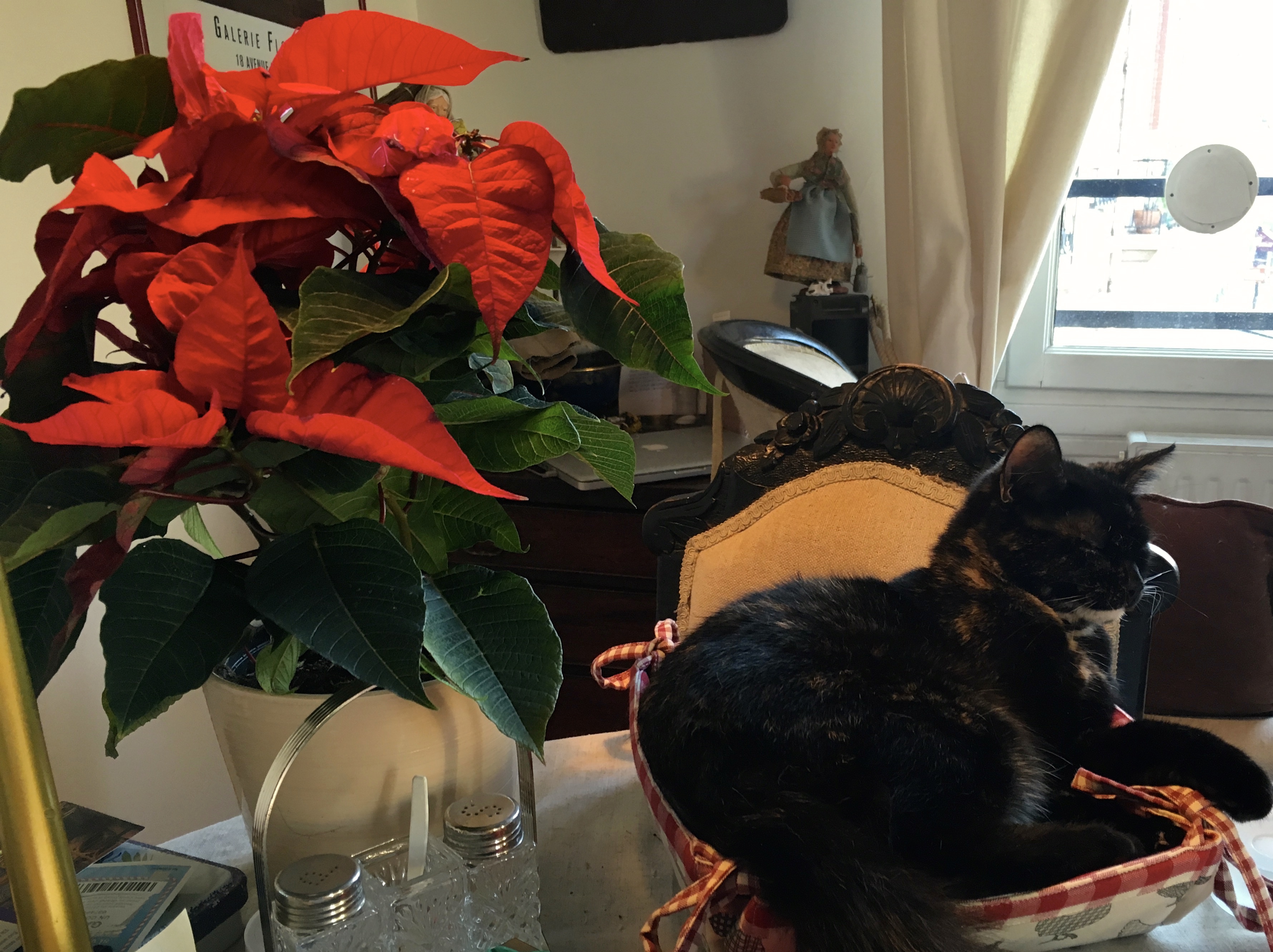 I fill up my caddy with all the fruit and vegetables I need then meander to the flower mart. I purchase fresh flowers every week. The stall is run by a family. The son is there every Wednesday along with a woman who may or may not be his wife. Last Wednesday, for some reason, I pulled out my phone and showed her a photo of Bijou. She immediately picked her phone up and showed me her two adorable cats.