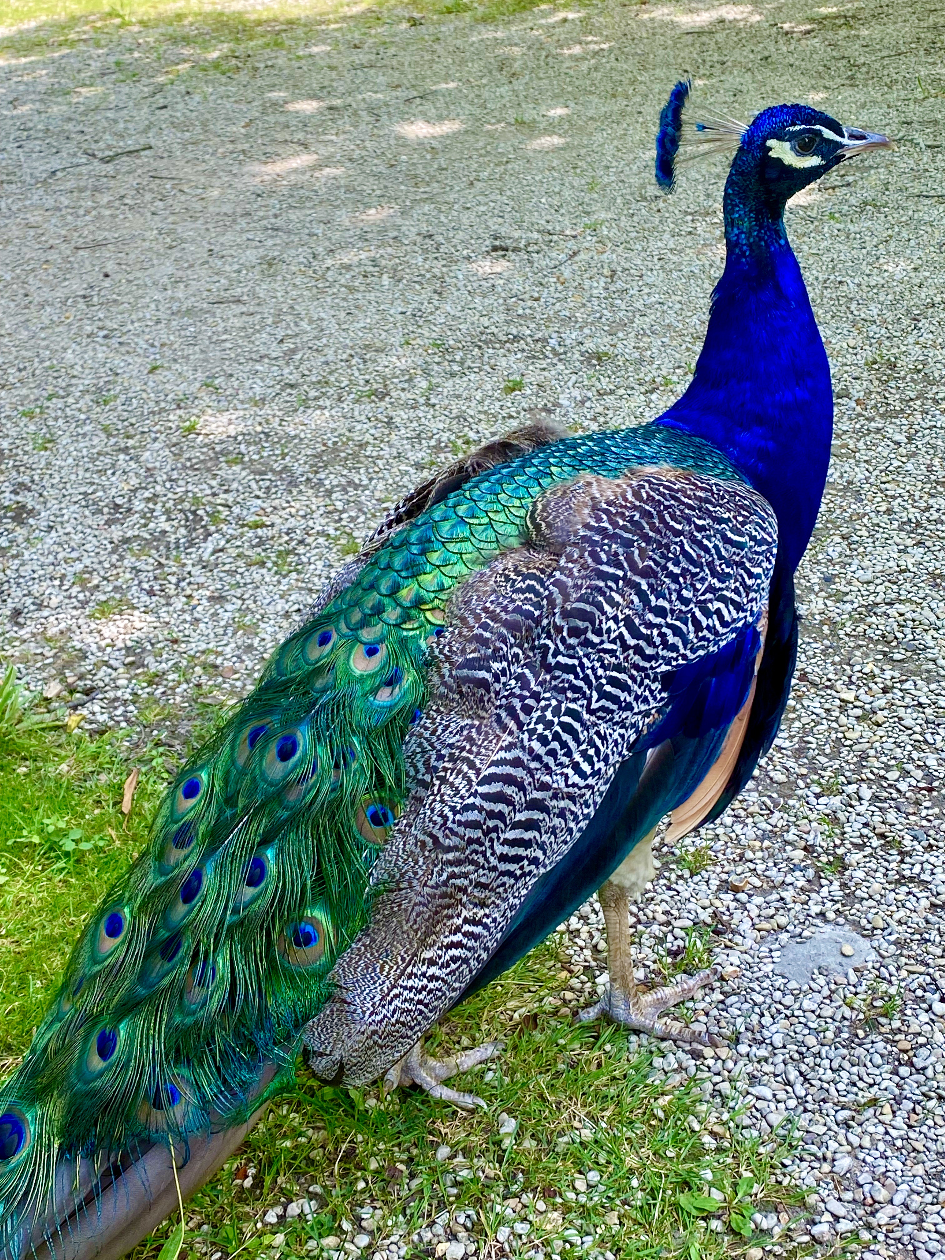 Peacock walking in Bagatelle, so friendly that s/he will just walk right up to you almost as if waiting to be petted!