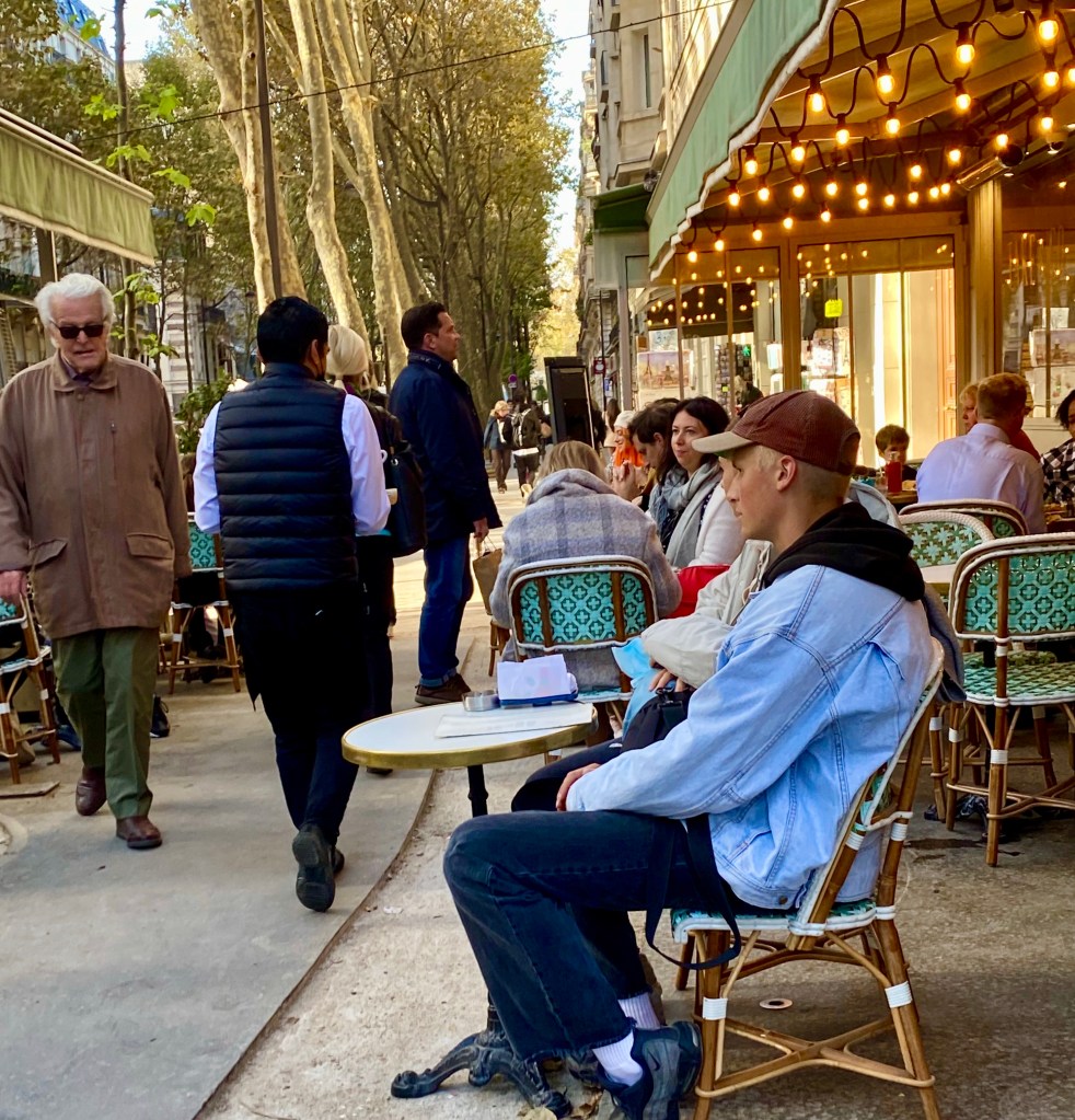 Since I was early, I walked for awhile in the 11th. The streets are just as wide as in the 16th but the two arrondissements couldn’t look more different. In the 11th, there are no trees shading the sidewalks. Graffiti, much of it fun and artistic, grace many of the walls of buildings and store fronts. Whereas the 16th feels upscale, the 11th feels very working class. In both arrondissements, however, to support social distancing, resaurants, bistros, and cafes have taken over the parking on the streets. Some have thrown down green carpeting to simulate grass. Many have brought in small trees and plants and put them next to the tables to give the air of outside comfort. It works. It is a welcome addition to all the streets in this writer’s opinion.