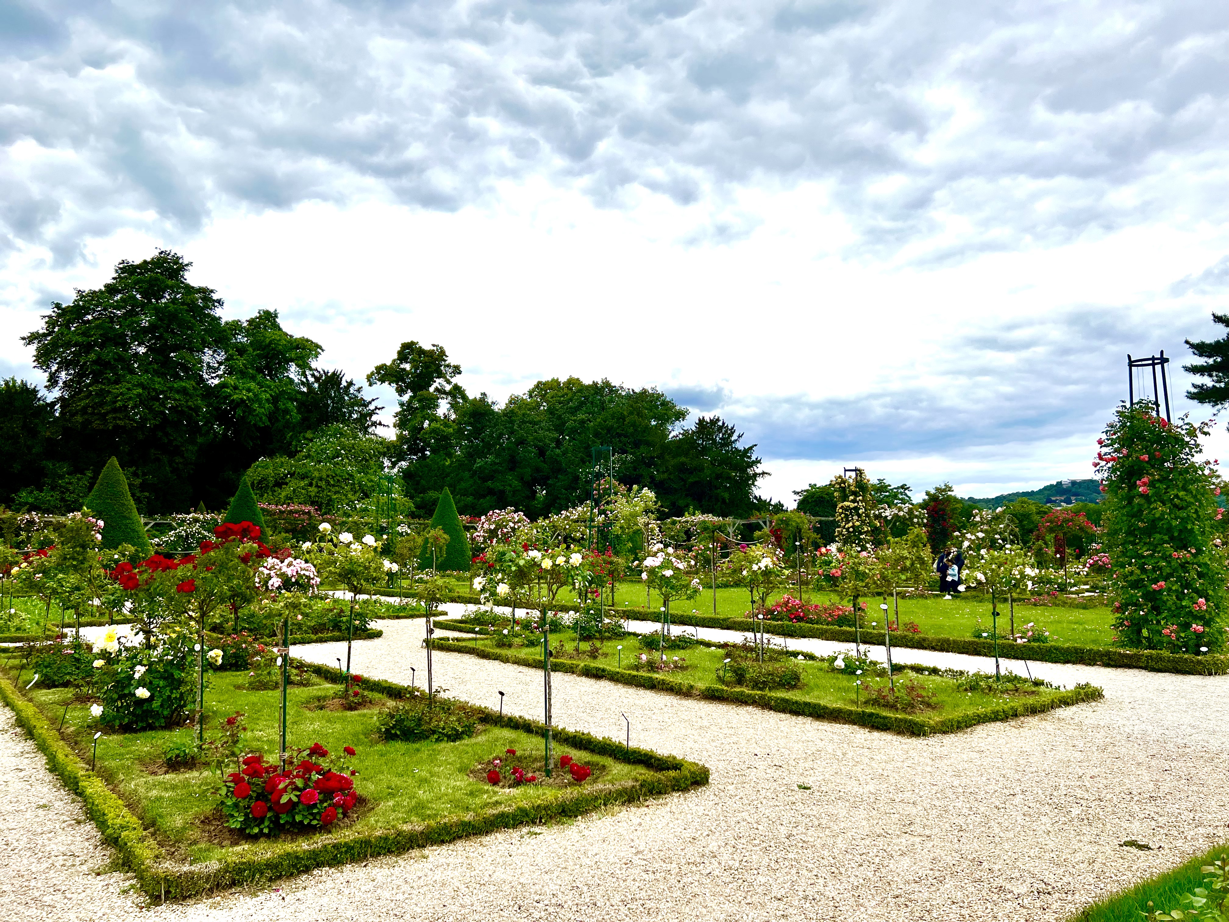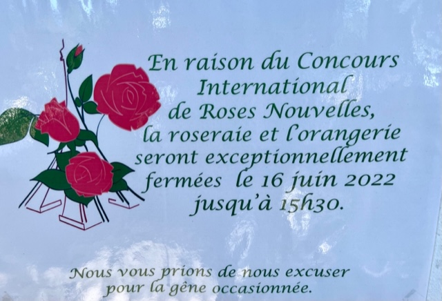 The Parc de Bagatelle is in rose heaven. Since I returned from Normandy mid-May, the roses have been in bloom. There is a formal rose garden, Roseraie Classique, at the far east end of the park and a natural rose garden, called Rosiers du Paysage, at the other end. I took a tour of Parc de Bagatelle on Tuesday and learned that the modern rose can bloom from May through Christmas. The Antique rose, which went out of favor for a long time, blooms only once during the season. These roses were moved to the very back of the formal garden and most people just pass by them in their attempt to get in the middle of the rainbow of color from rose bushes, rose trees, and trellises with climbing roses. There is a contest every year. Roses are brought in by different growers and watched over a two or three year period depending if they are in the formal garden or paysage garden. The judges come every week for six months before and during the season. They look for disease, hardiness, how the bush covers a piece of ground, the color of the leaves, smell, and how the petals fall off once the flower has died. It seems very complicated. Our tour guide, one of the judges, says she often has to give high marks to a rose she wouldn’t have in her own garden because of the criteria. Today, Thursday, June 16th, the winners are announced. The formal rose garden is closed for half the day while a huge ceremony is produced. While walking around on Tuesday, we saw flags from fifteen different countries.