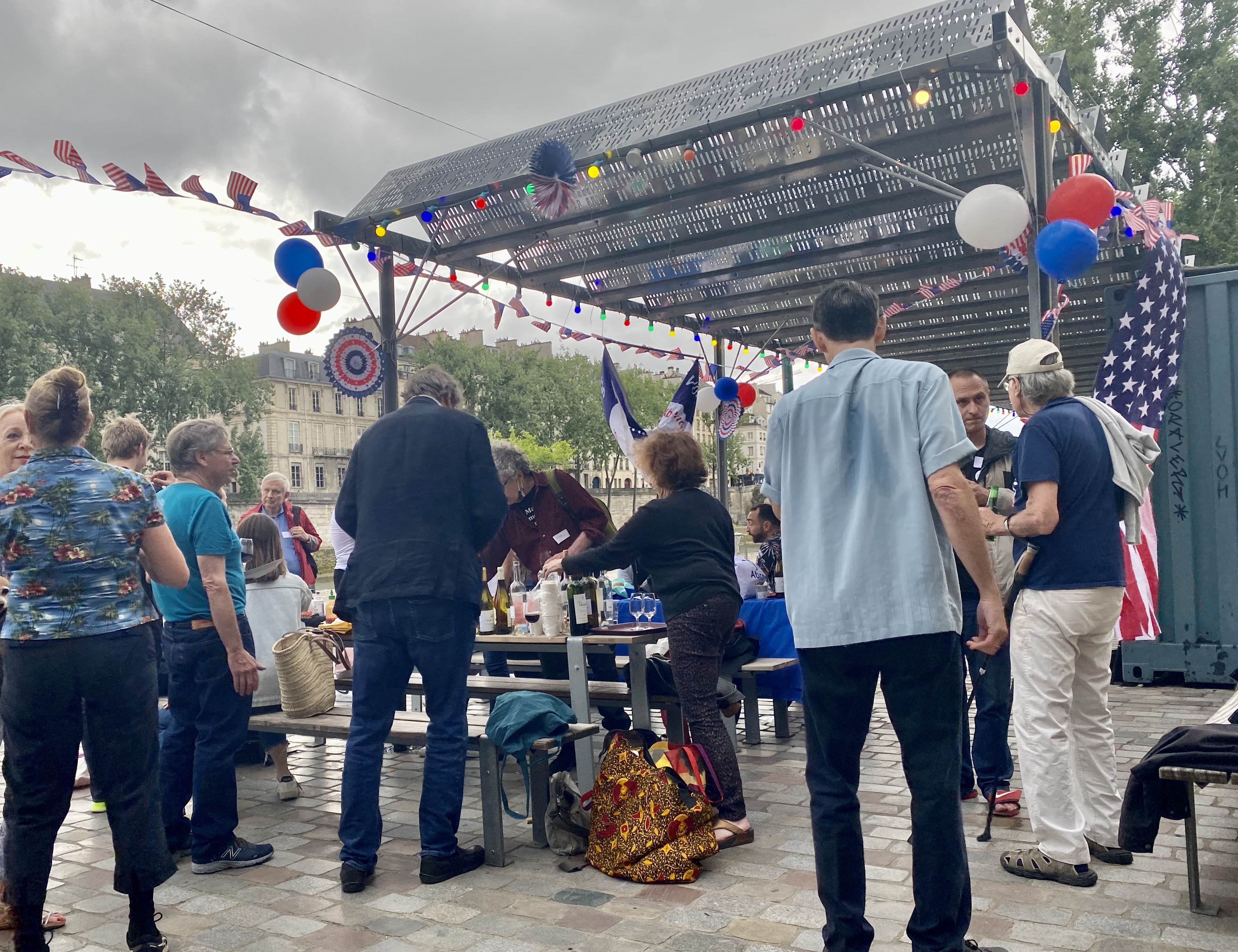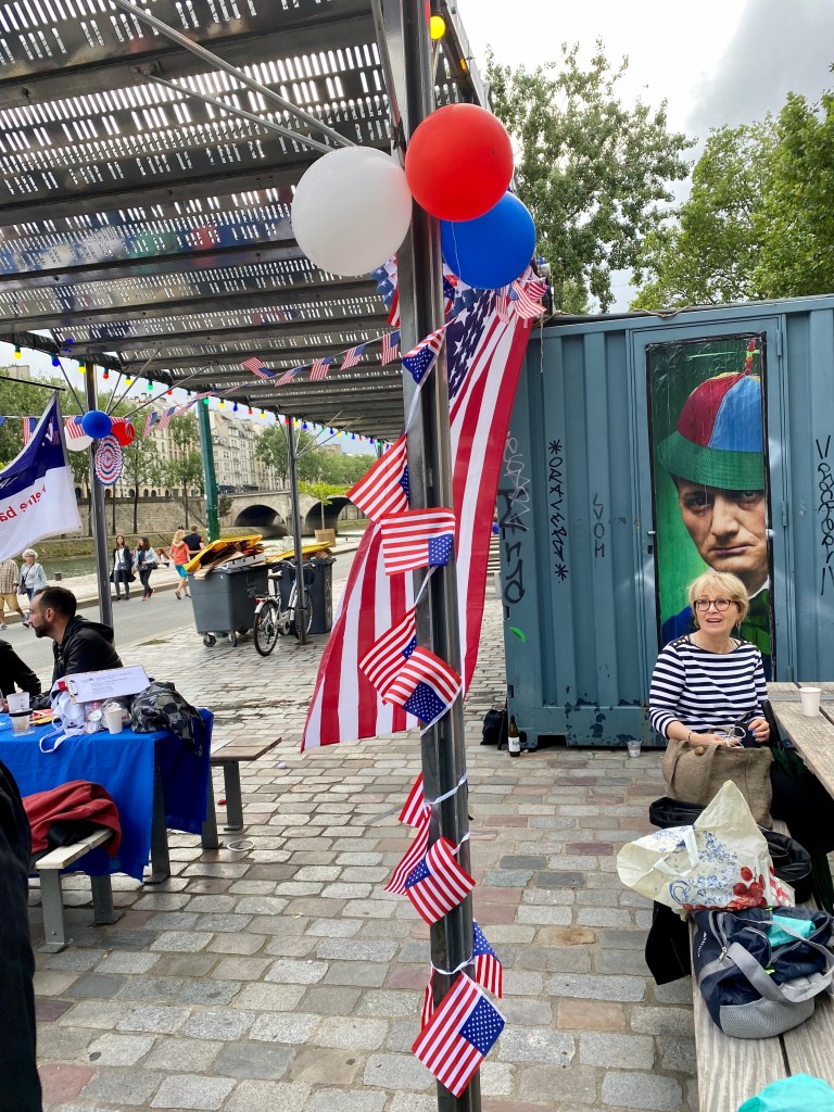 One of the largest chapters of Democrats Abroad is in France, and Sunday evening, the Paris contingent celebrated on the banks of the Seine at a funky bar called Les Nautes. It was the first live get-together in 2021. Plus, for many people, it was the first “night out” since the curfew was lifted. The larger part of the bar is outside seating: perhaps ten picnic tables that the staff of the Paris Chapter decorated in red, white, and blue and a Pride Flag proudly flew over one of the tables.