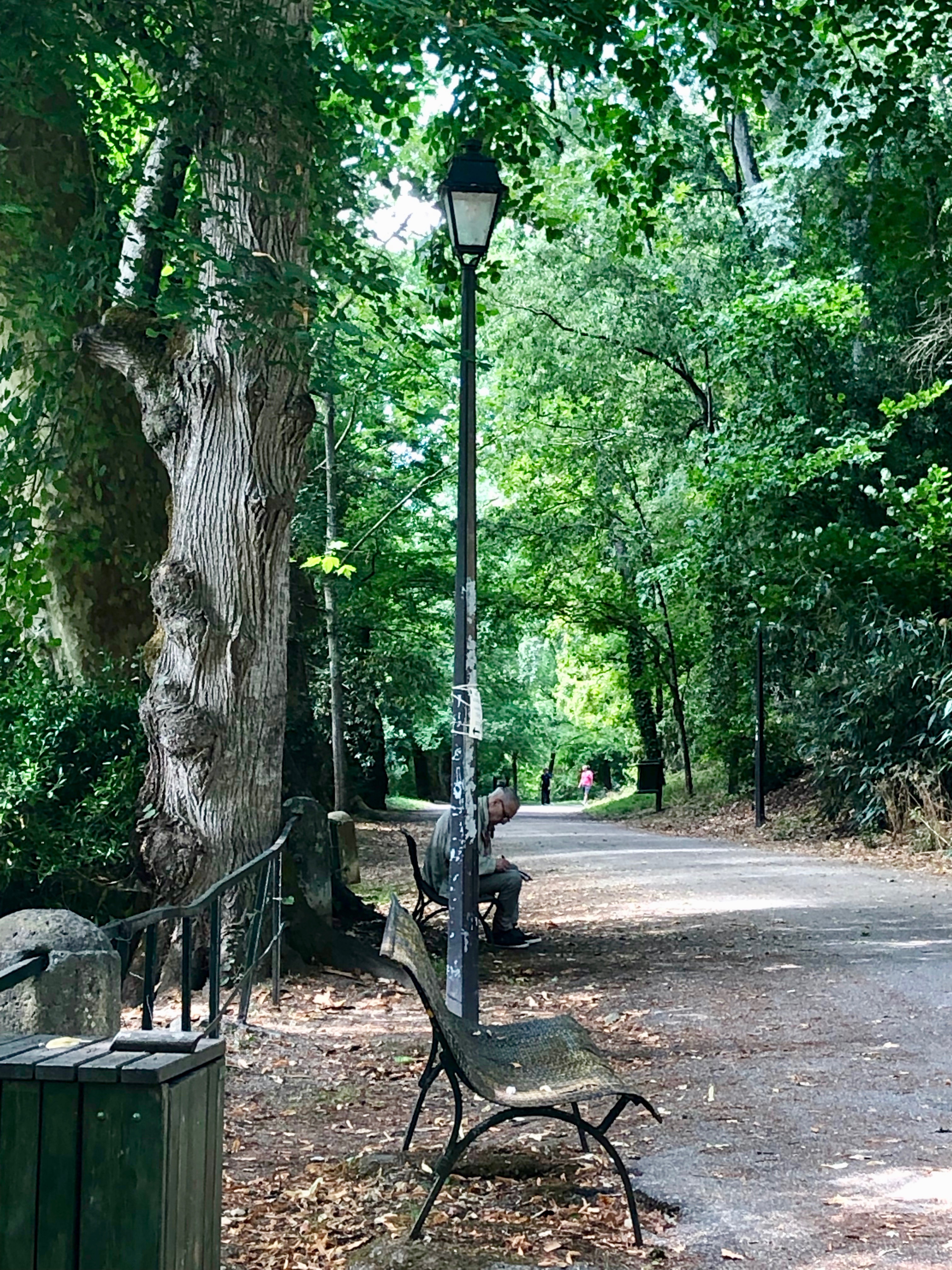 During the heat wave (canicule), if anyone was silly enough to go outside, we sought places that were shady to rest. Like the small mini-park below that is just before the bridge in Nérac.