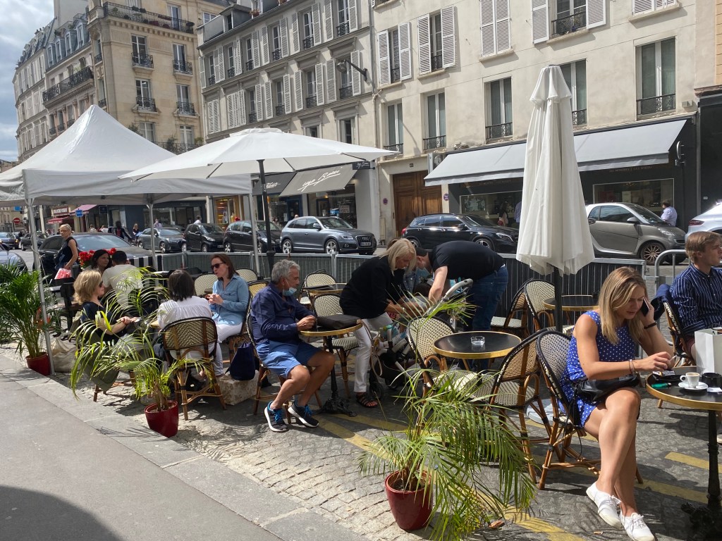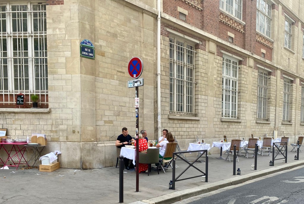 Restaurants and cafes were some that were forced to close. When they did open, at first, it was only for take-away. Then it was to be served outside, and finally, inside with strict instructions: all tables a minimum of one metre apart. So, creative ingenuity ensued. The cafes started taking over the sidewalks, then the parking along the side of the street. One restaurant near the American Library in Paris, even set up tables across the street. Paris has always been a sidewalk culture, a cafe society. But this is lively and wonderful.