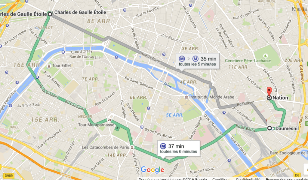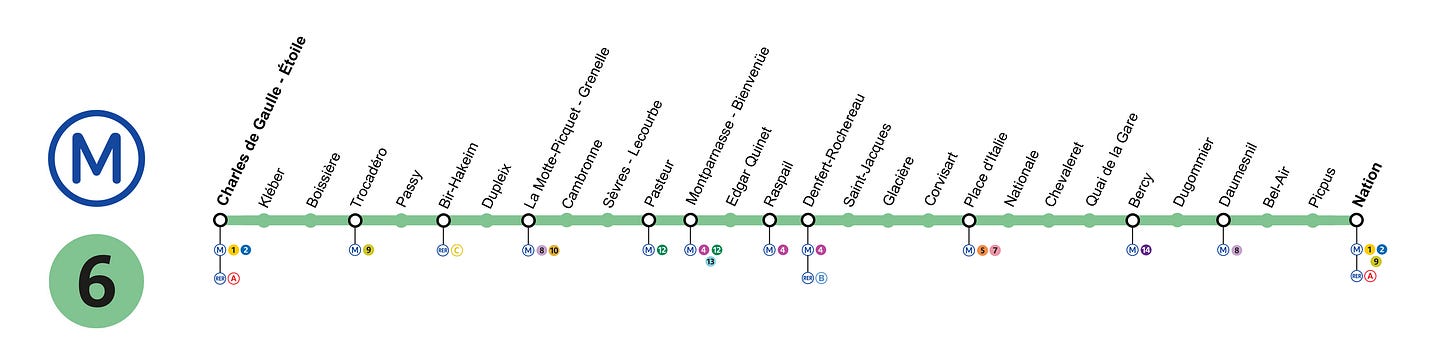 In Paris, each metro line has its own ‘vibe’, but Line 6 is one I really appreciate. It traverses the southern side of Paris, connecting Nation in the east to the Charles de Gaulle – Etoile station in the west, shown as a green line in the image below: