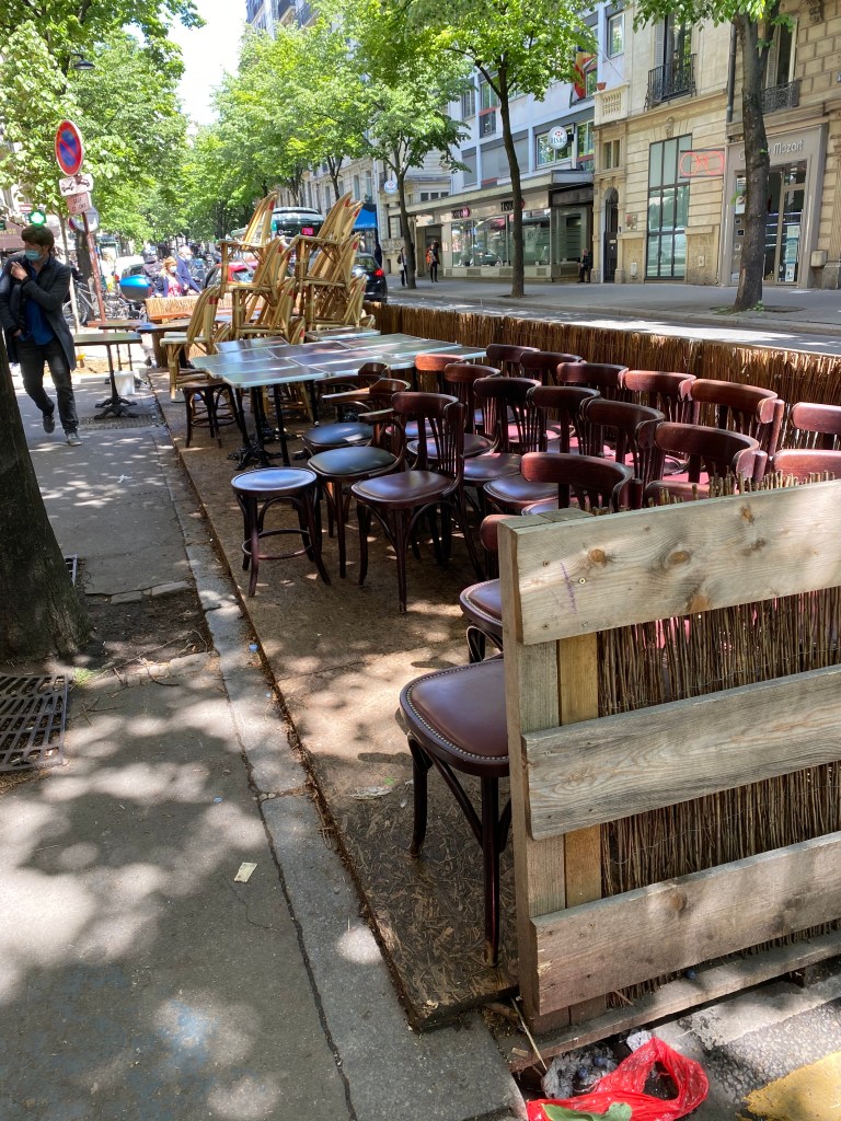 As many of you know, (and if you love and miss Paris, you are probably paying attention), today, May 19th begins the second phase of the ‘déconfinement’ that began for some establishments last October. For Parisians, the most important thing happening is that terraces will open for cafés and restaurants. The minute it was announced, I noticed chairs and tables being moved outside in preparation. Some two weeks ago. One café that I pass every day on my walk built a new terrace. Everyone will need umbrellas. It has been raining on and off almost every day for two weeks. And it’s chilly. I’m actually getting used to this. People talk about Springtime in Paris but in the eight springtimes that I have lived here, there may be a burst of warm weather in February, March or April, but nothing permanent until early June. Then we’ll have three days of Spring and voilà, it will be summer with the canacules (heatwaves) just around the corner.